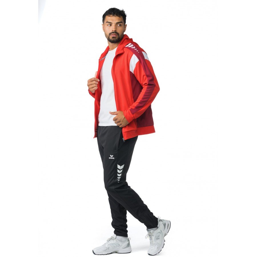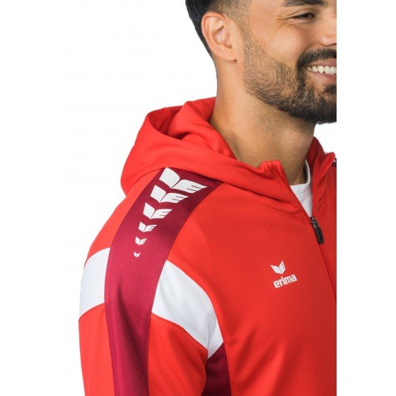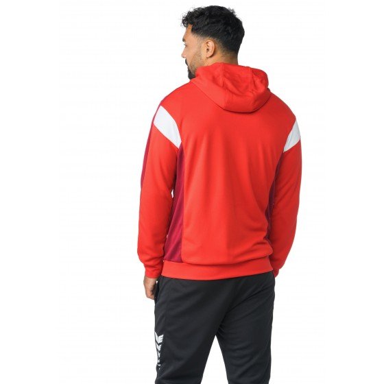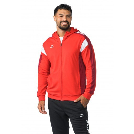 Treniruočių bliuzonas su gobtuvu derina modernų dizainą ir aukštą funkcionalumą. Kvėpuojantis interlock vidus, pamušalas gobtuvas ir smakro apsauga ant užtrauktuko užtikrina patogų prigludimą. Įprastas kirpimas ir nuleistas petys suteikia švarkui kasdieniškumo, kurį užbaigia madinga ERIMA Wings spauda ant pečių. Šoninės kišenės su užtrauktuku yra ypač praktiškos, kad galėtumėte saugiai laikyti savo vertybes.